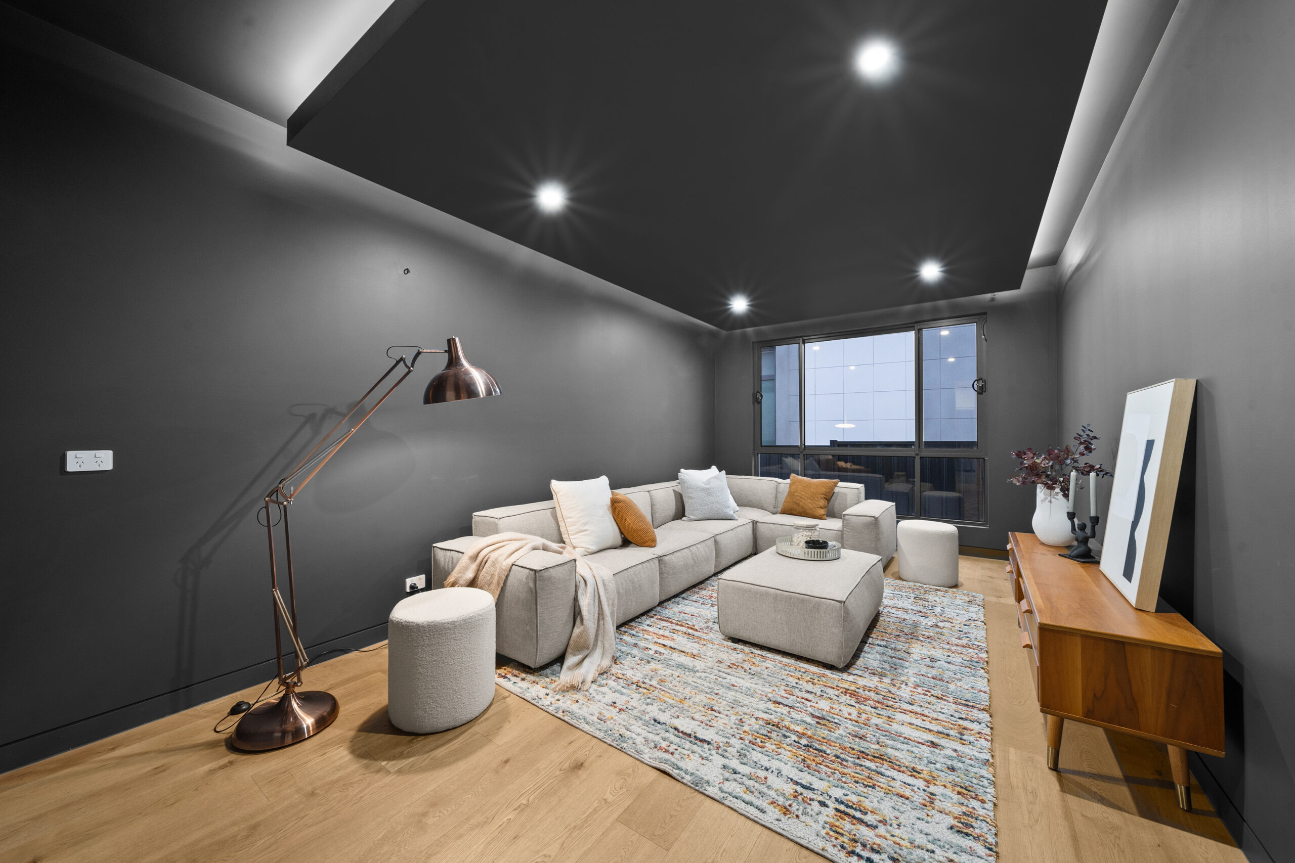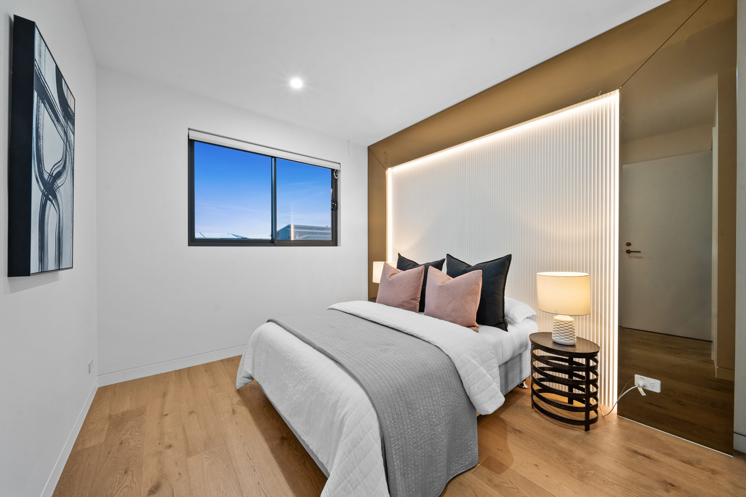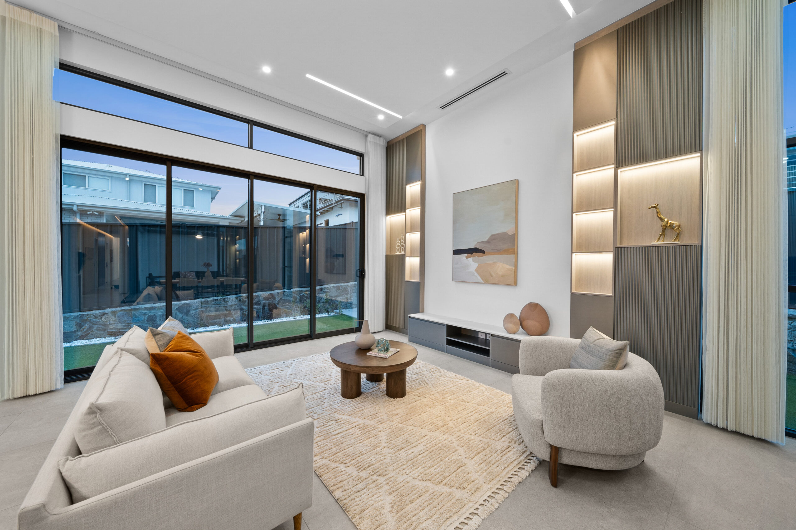 Luxury is felt in every corner, from the brushed copper tapware and custom wardrobes in all bedrooms, to the striking epoxy-finished garage floor. The home features an extensive mood and strip lighting system, paired with electric blinds and Veri shade blinds, allowing you to set the perfect ambiance with effortless precision.