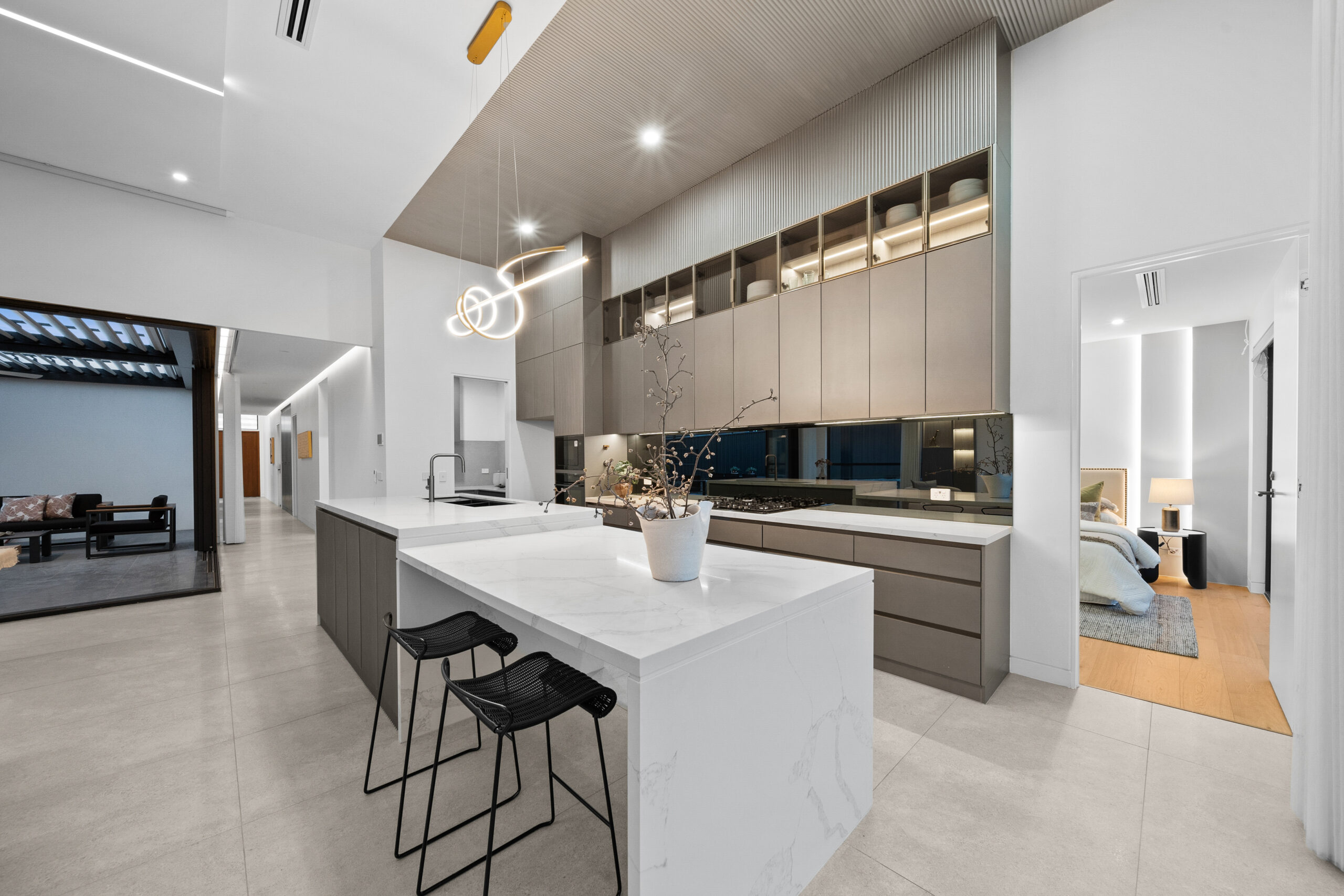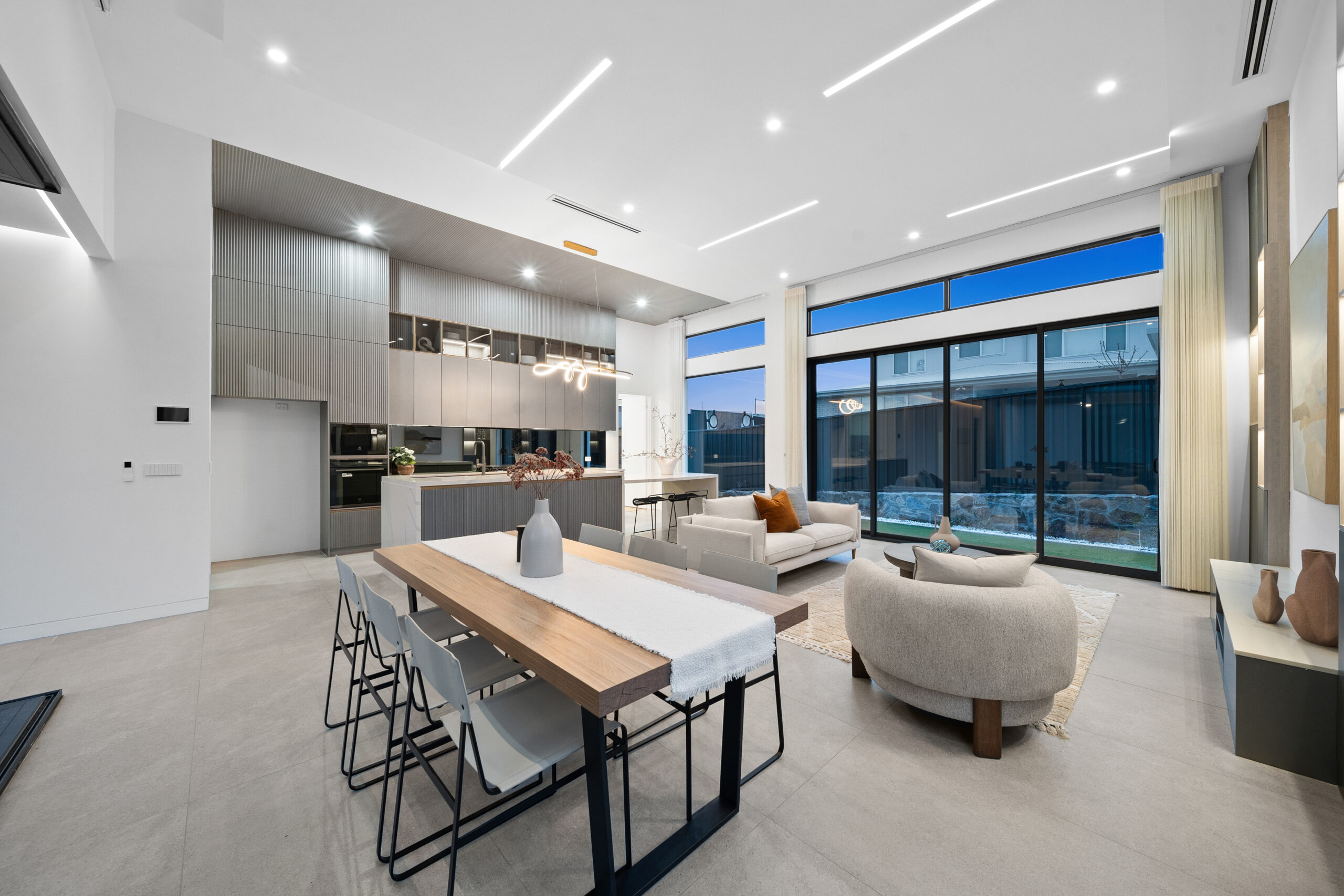 Step inside and be greeted by soaring 3.5m high living areas, where space and light harmonise to create an atmosphere of grandeur. The stunning corner open slider stacker doors seamlessly extend the living space to the outdoors, connecting to the Smart blade Louver Roof System alfresco which is a masterpiece in itself, designed for all-seasons entertaining.